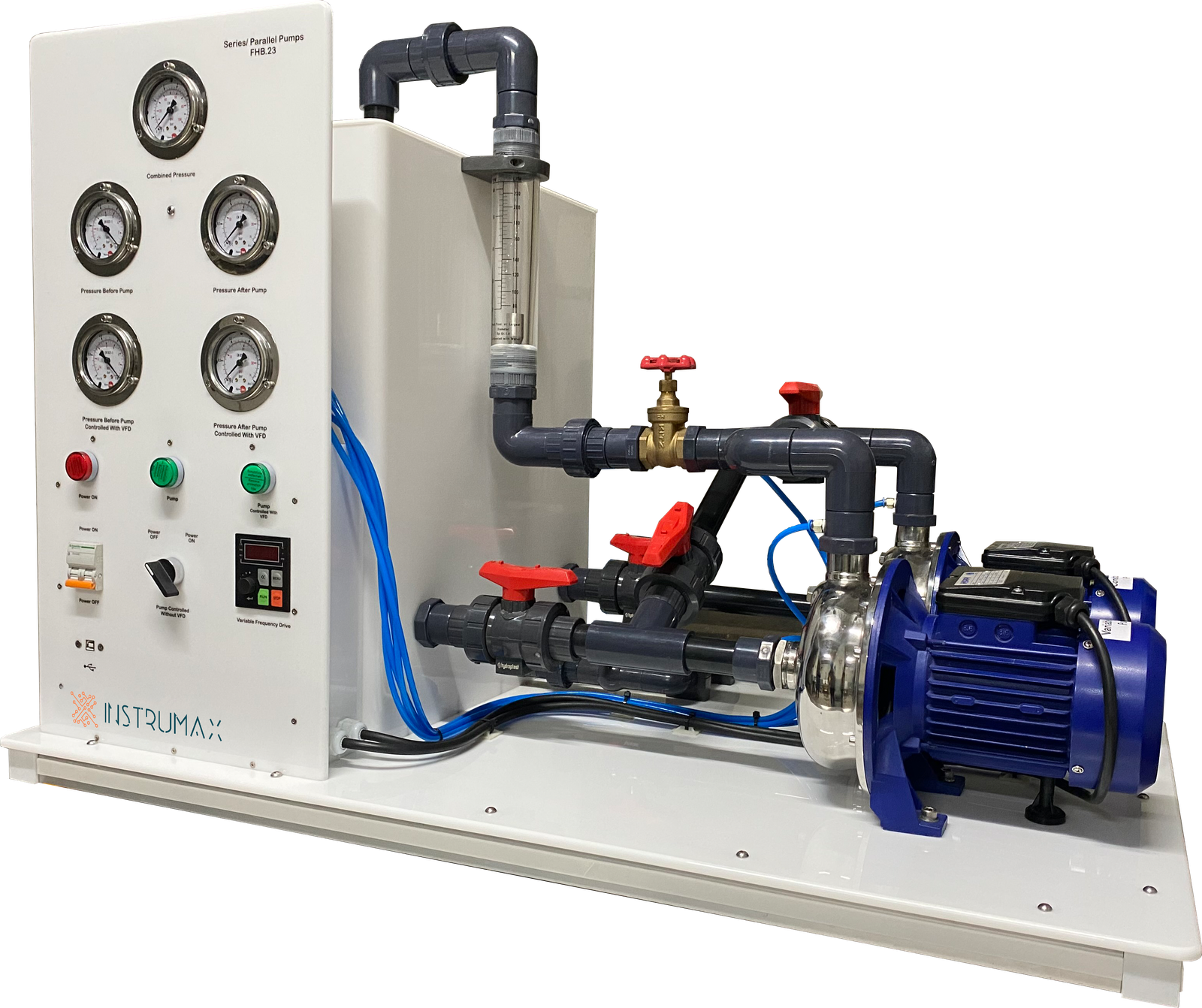 The Series-Parallel Pump Bench is compact, versatile unit designed to demonstrate the performance of centrifugal pumps operating in series and parallel configurations. It provides a clear, hands-on understanding of flow, head, and efficiency characteristics, making it an essential tool for advanced studies in fluid mechanics.